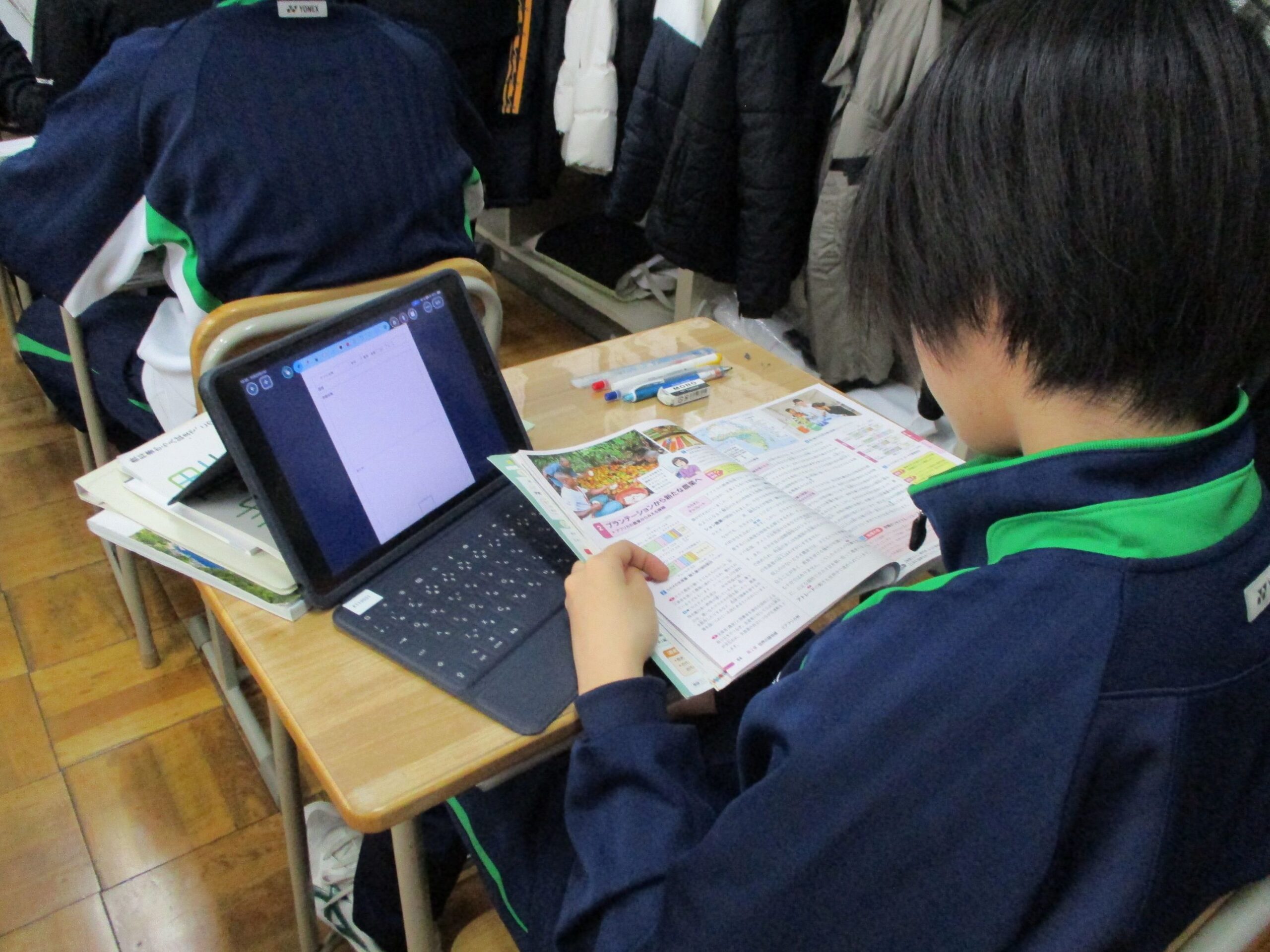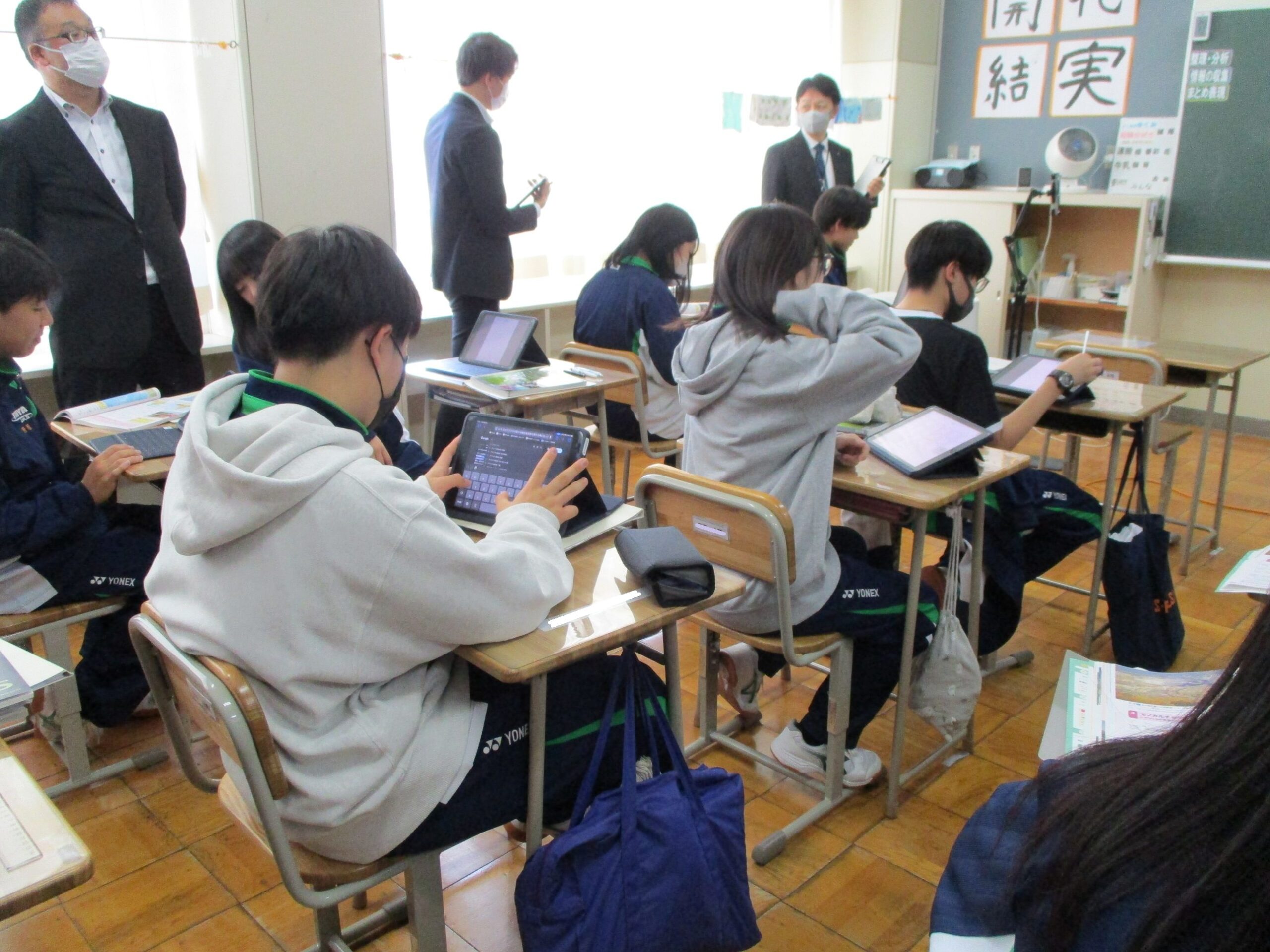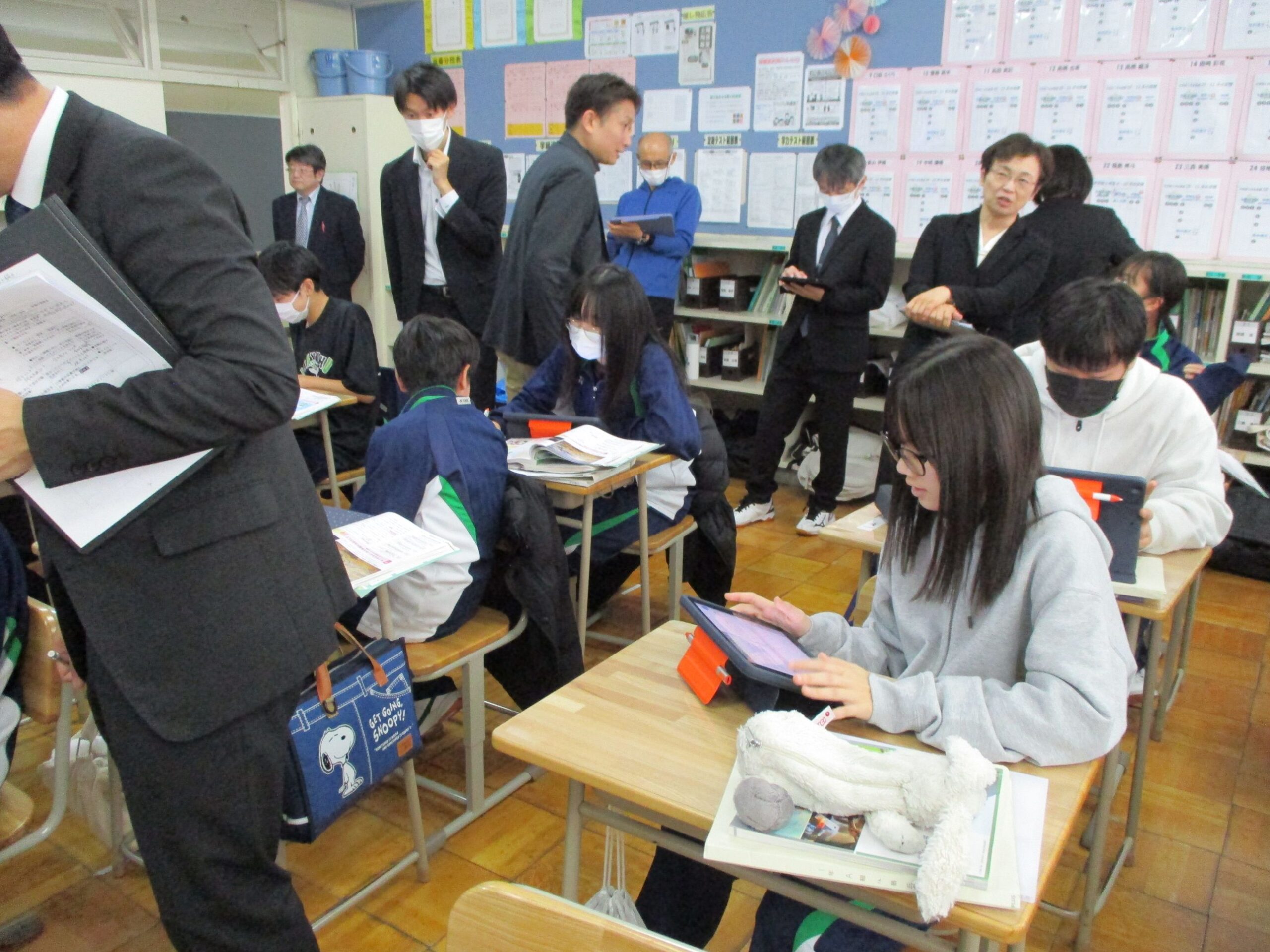 当日は1年生の社会科の授業が公開され、生徒が自分で課題を追求する様子を参観しました。