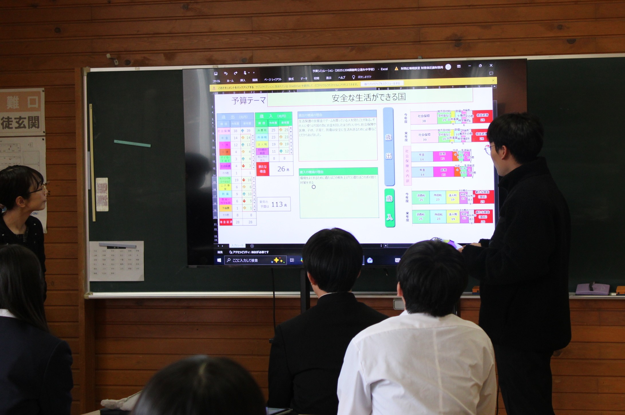 はじめに、身近な公共サービスや公共施設をもとに「財政とは何か」について学習した後、「日本の予算を作ろう」というグループワークに挑戦しました。